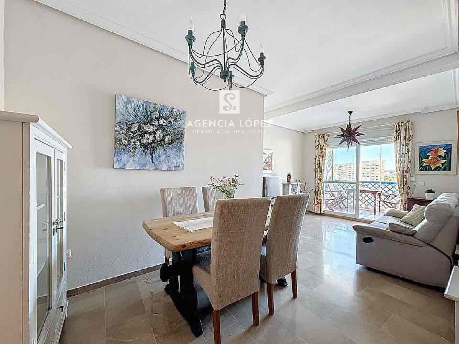 Accedes a través de un amplio recibidor, al salón con amplia cristalera de acceso a la terraza, desde donde podrás disfrutar de vistas laterales al mar, que hacen de la estancia un espacio muy luminoso, perfecto para relajarse o compartir momentos con familiares y amigos,